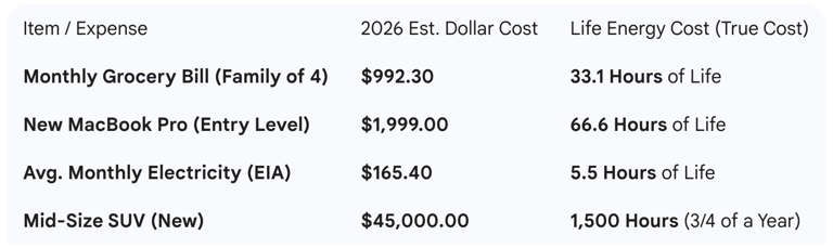 The core innovation of The Vera Math is moving beyond traditional bookkeeping to measure the Life Energy cost of a purchase. Most people view a $100 expense as a deduction from a bank balance. Our methodology, however, views it as a deduction from your finite lifespan.